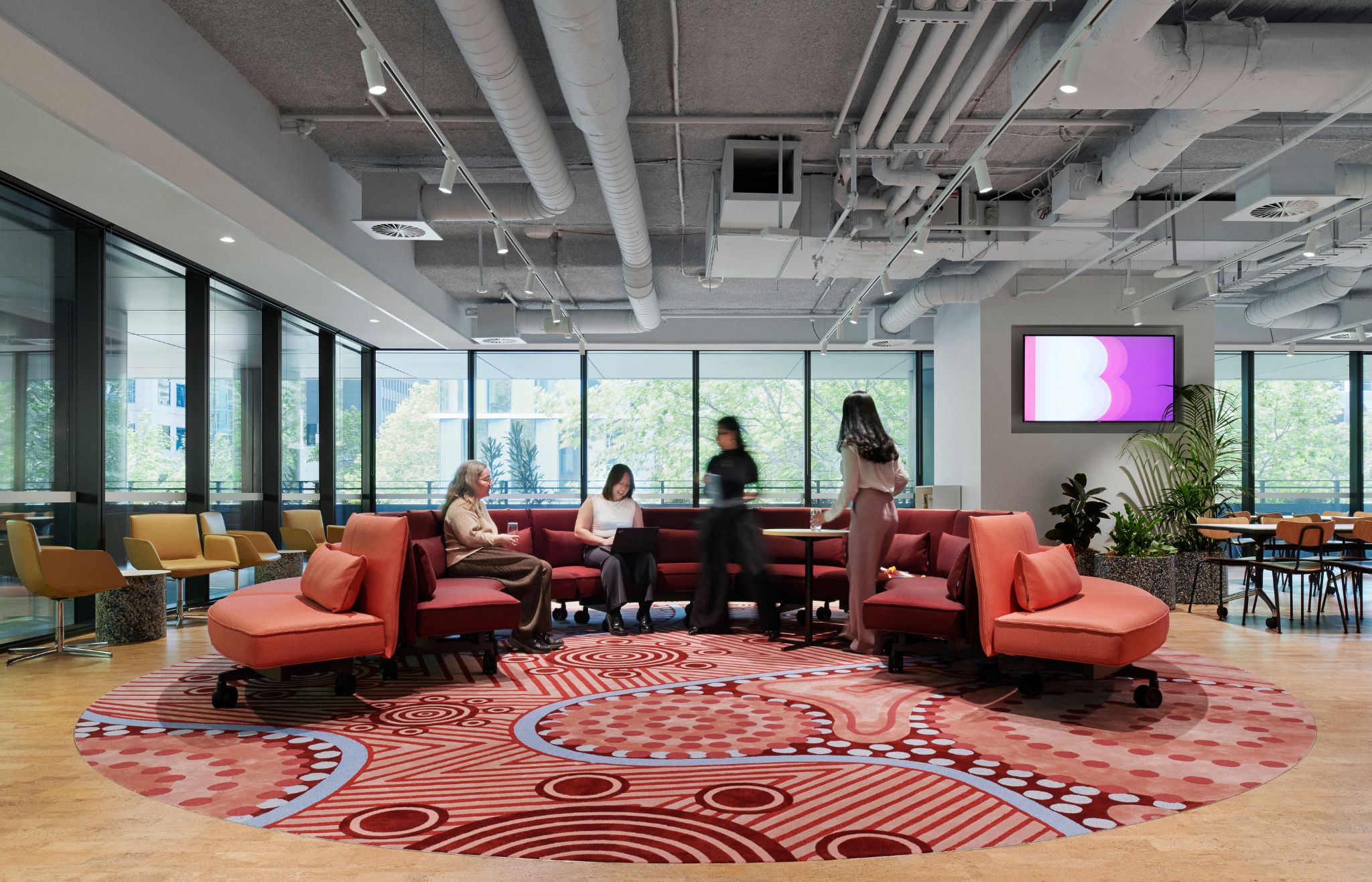 At Bendigo Bank’s head office, a bespoke hand-tufted rug becomes more than a design feature — it establishes a place of connection, story and cultural expression within the workplace. Created in collaboration with accomplished Indigenous artist Samantha Richards, the rug introduces layered meaning through colour, pattern and texture. The design brings movement and narrative to the floor plane, grounding the surrounding interior while reflecting the cultural symbolism embedded in the original artwork. The Bendigo Bank project illustrates how collaboration between artist, designer and maker can transform the floor plane into a powerful platform for culture, identity and connection.
