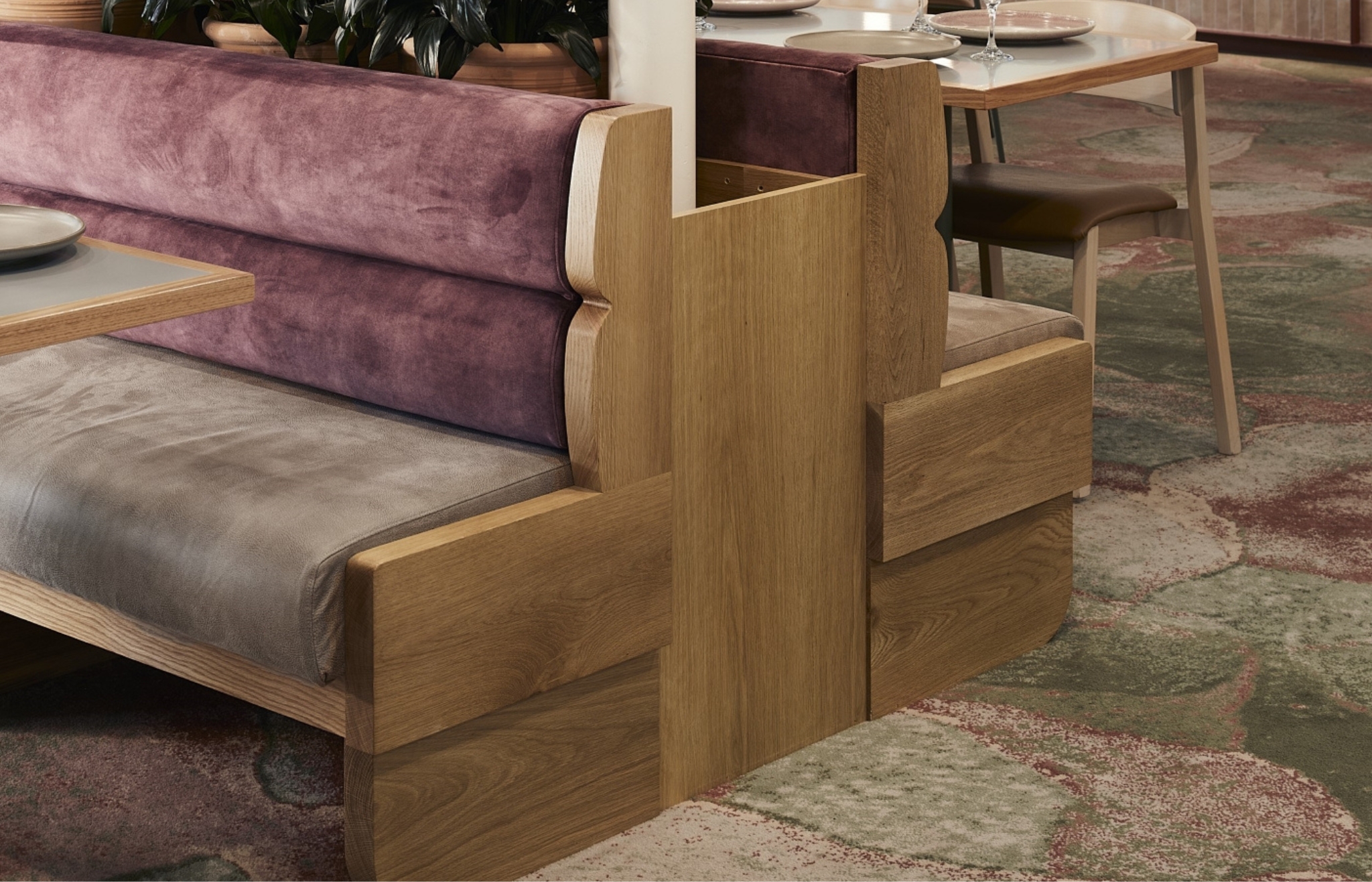 In collaboration with Fabric Architecture, Signature Floors designed Axminster carpet for the Empire Bay Tavern. The colour palette for the project includes deep burgundy reds and a eucalypt green hues. The carpet design encapsulates the natural beauty of the local area, drawing inspiration from the national park that borders the venue. The bespoke carpet features patterns reminiscent of the peeling bark of the angophora trees, anchoring the tavern’s design in its unique local environment.
