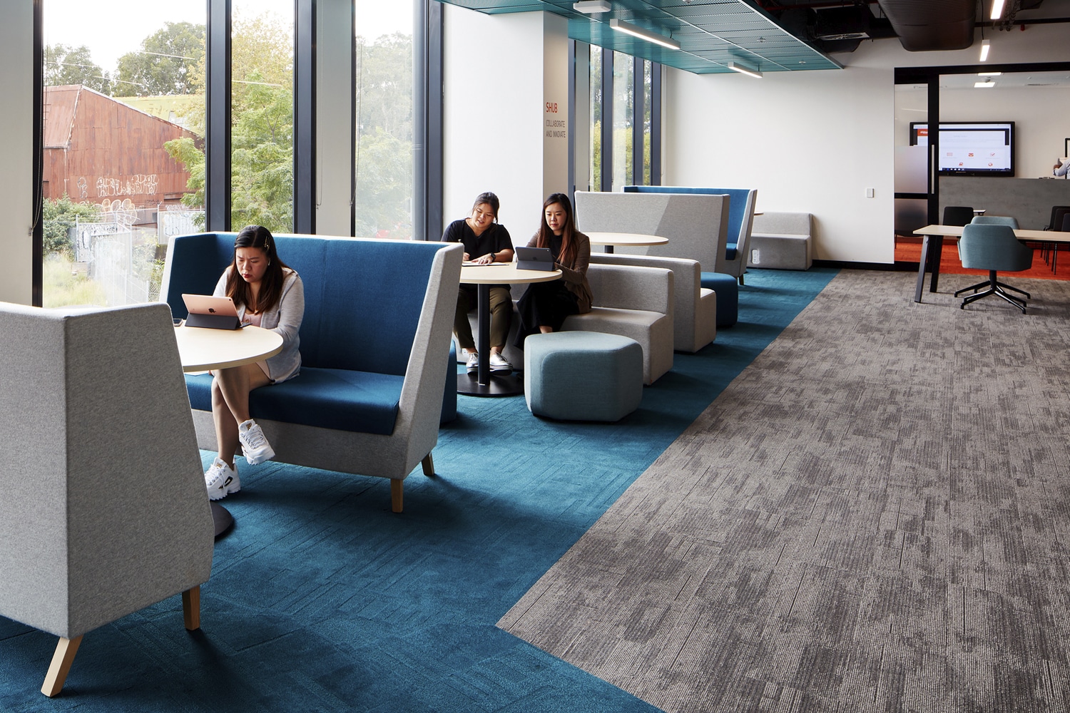 Our Vivid carpet tiles, for instance, help in creating activity zones. Groove’s neutral hues, on the other hand, work to establish traffic flow, providing directional guidance and more. The choice of flooring products also lends flexibility, ensuring each space can facilitate multiple activities.