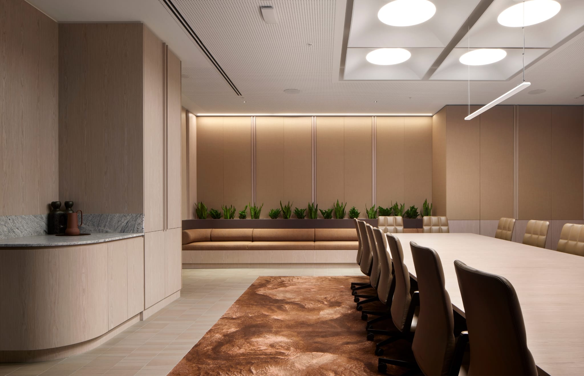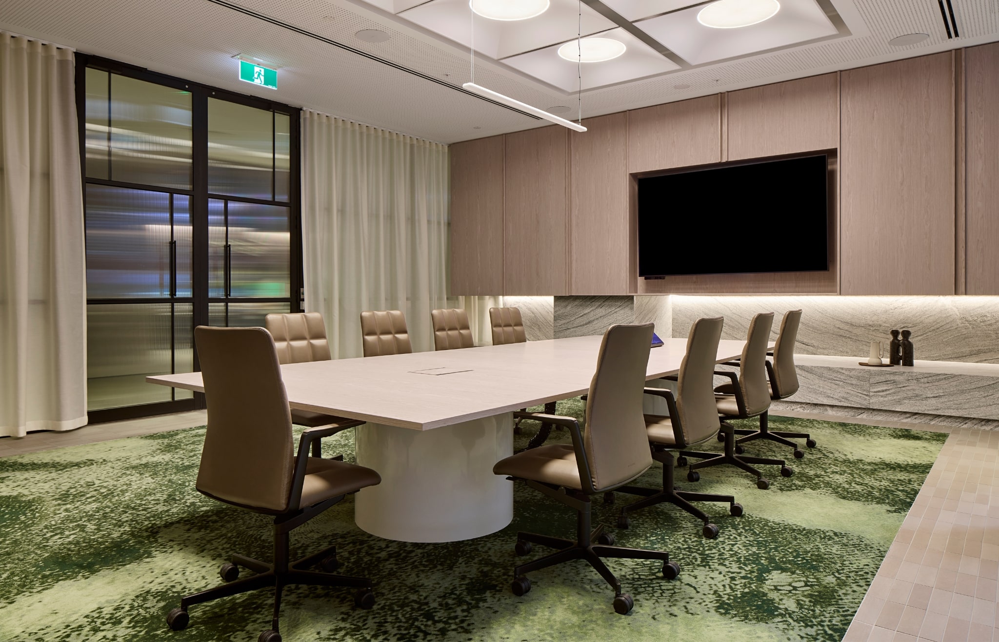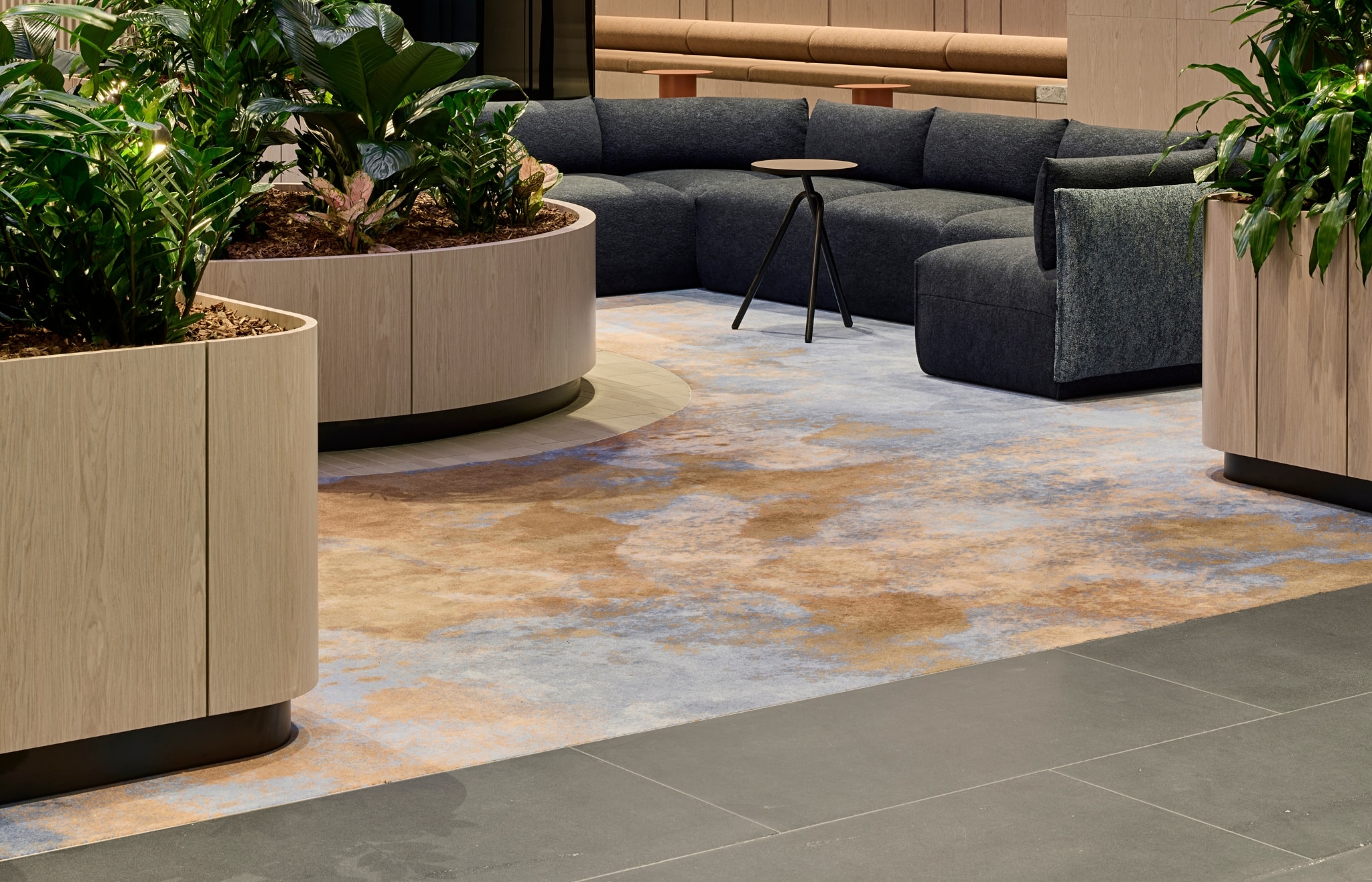 FOREST, RIVER, MOUNTAINS | Inspired by Victoria’s diverse landscapes, the ground plane at 570 Bourke Street was reimagined as three distinct zones — The Forest, The River and The Mountains — each defined through bespoke materiality, colour and form. To help bring this narrative to life, the Signature Studio team designed custom Axminster inset rugs that anchor these experiences, adding warmth, tactility and visual cohesion across the transformed space. The result is a sensory-rich, community-focused environment that elevates amenity, strengthens tenant engagement, and celebrates the character of the local landscape.