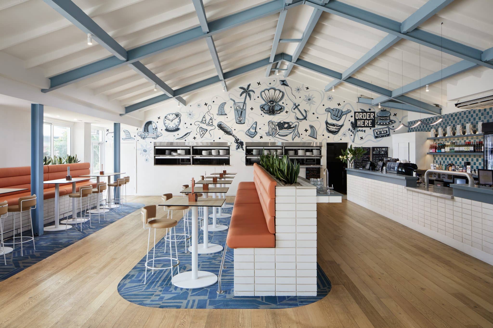 Designed by Fabric Architecture, the Kincumber Hotel seamlessly blends urban street style with a coastal holiday feel. Signature Floors contributed to this unique aesthetic using the Signature Studio X Megan Park Axminster carpet to define the dining spaces, adding both elegance and functionality to the hotel’s vibrant atmosphere.