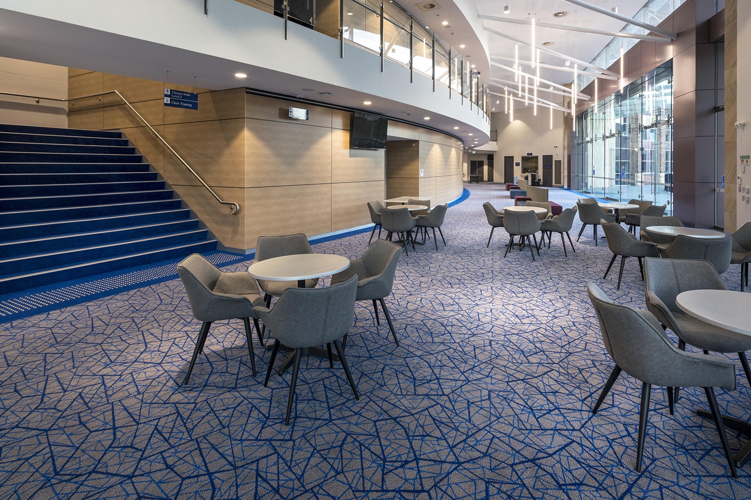 The Performing Arts Centre at Knox Grammar School has been designed to inspire and promote excellence in music and drama. As the performing arts play an integral role in the cultural life of Knox, state of the art facilities were required to support the next generation of performing artists. The Signature Studio designed custom Axminster was the perfect flooring solution for the project. The carpet design features a geometric pattern in a complementary colour palette made up of cool grey hues and a bold blue linear pattern.