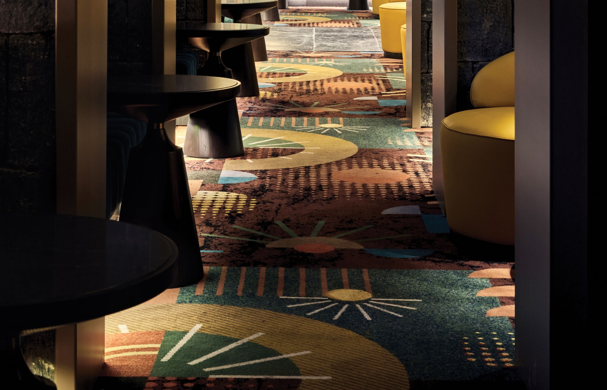 A WINE BAR LIKE NO OTHER | Drowned in luxury with dimly lit booths the Olivine wine bar is located within heritage listed bluestone walls. Inspired by the colours in the feature artwork, the Signature Studio team designed a custom axminster carpet, adding to the ambience found in this secluded and intimate space.